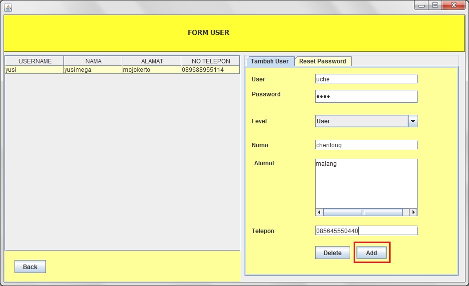 Pertama anda buat tampilannya dulu seperti ini, disitu ada tambah user dan reset password.